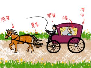 脳が感情や感覚をコントロールして、魂が決めた目標に向かって、肉体で行動に起こすということを馬車に例えて説いているのです